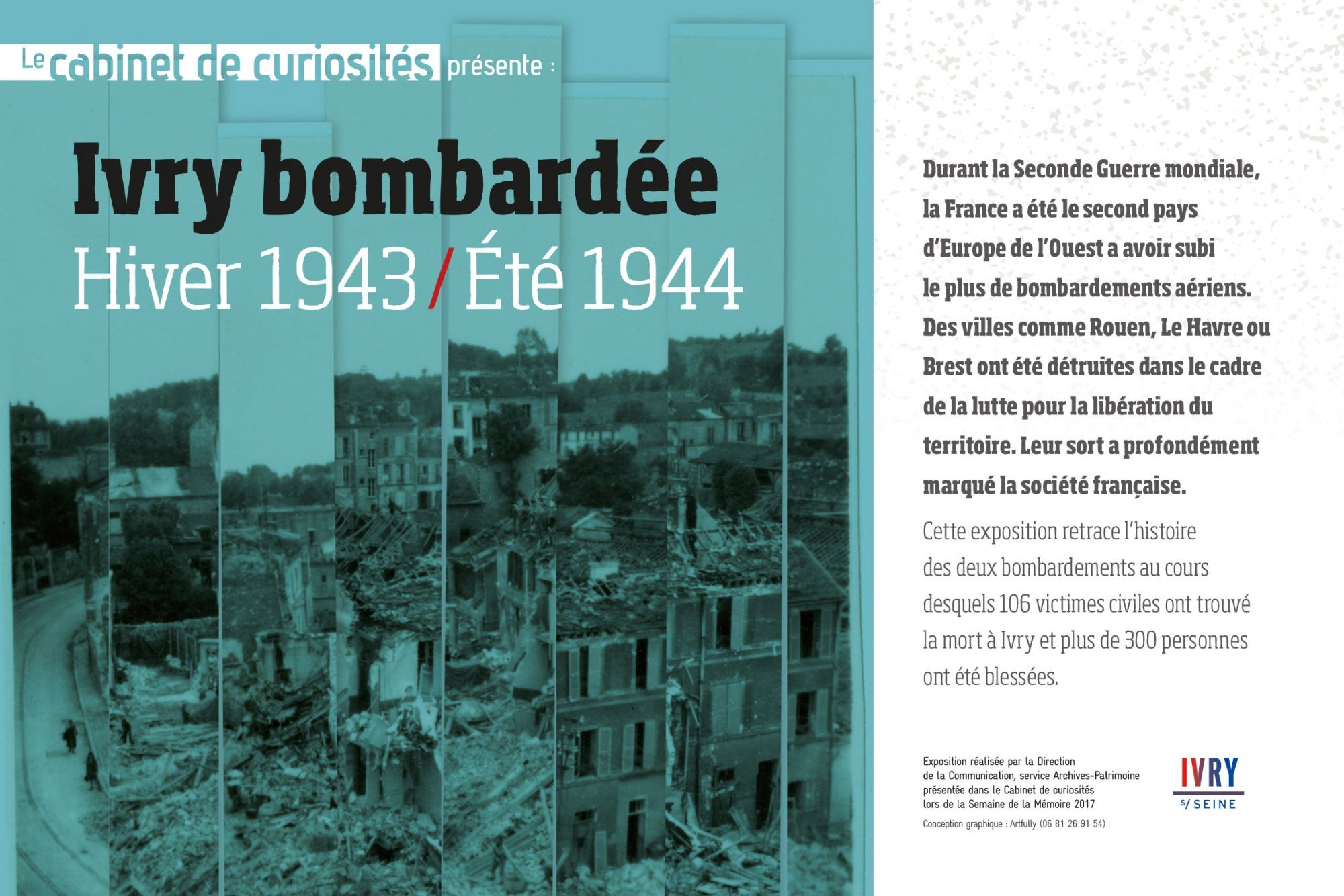 À partir d’archives et de photographies inédites, l’exposition Ivry bombardée : Hiver 1943 / Été 1944, réalisée par le service Archives-Patrimoine avec la collaboration des élèves d’une classe de 3ème du collège Henri Wallon, vous fait découvrir l’histoire de ces évènements aux conséquences humaines et matérielles considérables.
