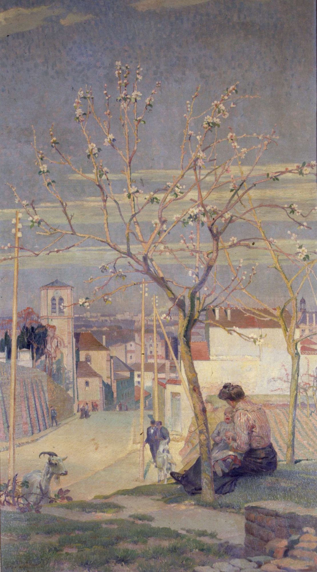 Au premier plan de ce tableau, deux arbustes sont en fleurs : c'est le printemps. Une femme, avec un chignon, vêtue d’un chemisier rayé et d’une jupe longue, est assise sur l’herbe, au bord d’un sentier. Elle tient un bébé dans ses bras. Nous apercevons derrière elle un petit champ. Des chèvres circulent en liberté. En contre-bas, des poteaux électriques en bois se dressent de chaque côté d’une rue en terre. Nous remarquons quelques passants. Cette voie longe un grand mur en pierre puis une église : c’est l’église Saint-Pierre-Saint-Paul et le mur d’enceinte du cimetière communal ancien. Quelques bâtisses s’élèvent de chaque côté. C’était la rue Jean Picourt, qui amenait au centre d’Ivry.