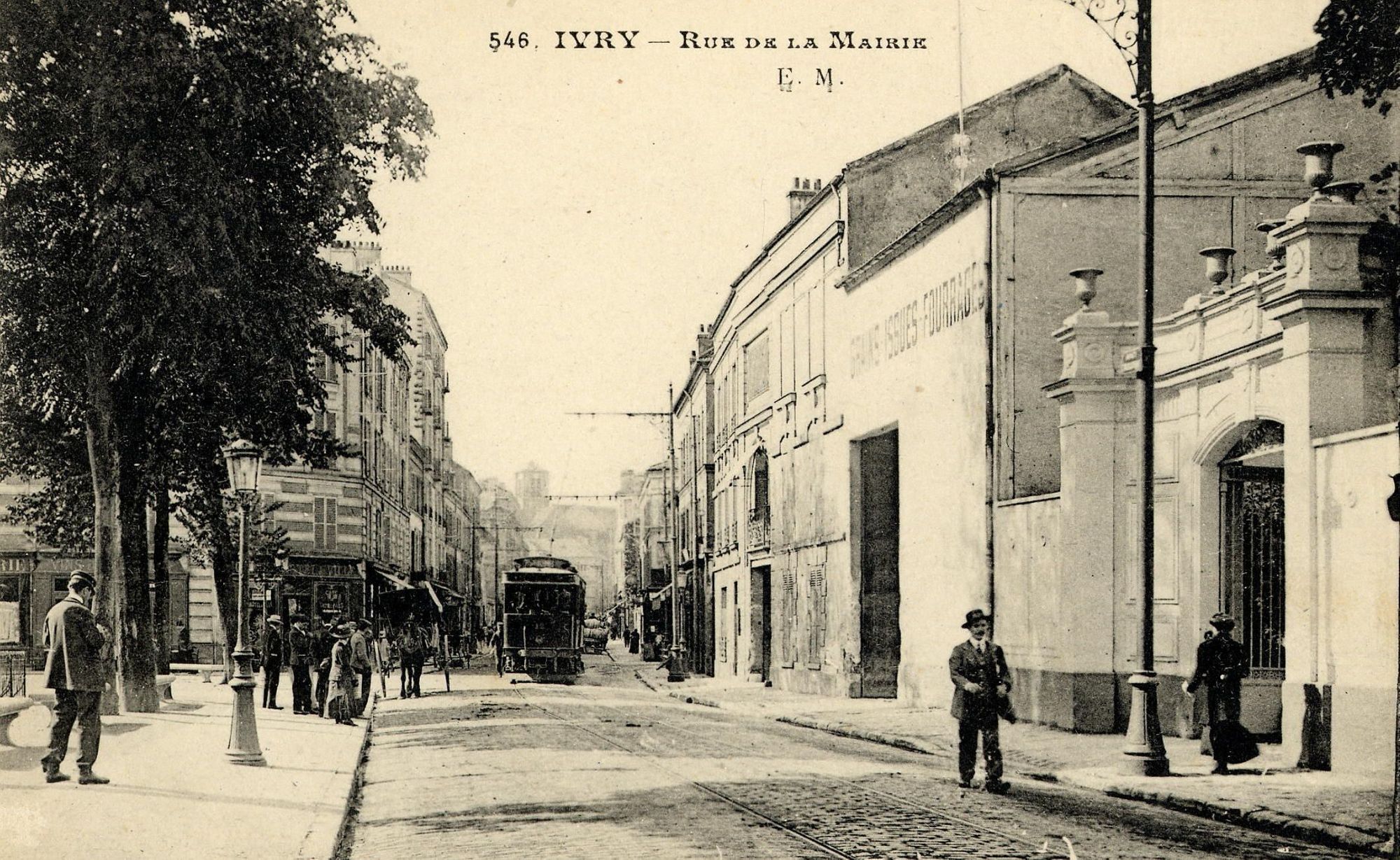 Sur la droite, se trouve un trottoir large avec des poteaux électriques décorés de fer forgé, pour alimenter le tramway. Sur la gauche, nous devinons le début de l'esplanade de la mairie d'Ivry qui se trouve hors-cadre. Des lampadaires et des arbres bordent la rue. La rue est animée. Un homme avec une casquette et une chasuble lit son journal. Un groupe de passants attend probablement pour traverser. Un tramway, une calèche tirée par un cheval et une charrette transportant des tonneaux se croisent. À droite, sur une façade claire, nous observons une inscription peinte : grains-issue-fourrage. C'était un entrepôt. Il vendait des aliments pour les chevaux qui étaient encore très utilisés pour transporter individus et marchandises. À côté, un portail sculpté, surmonté de vases en pierre délimite l’entrée de la maison de santé destinée aux malades « aliénés ».