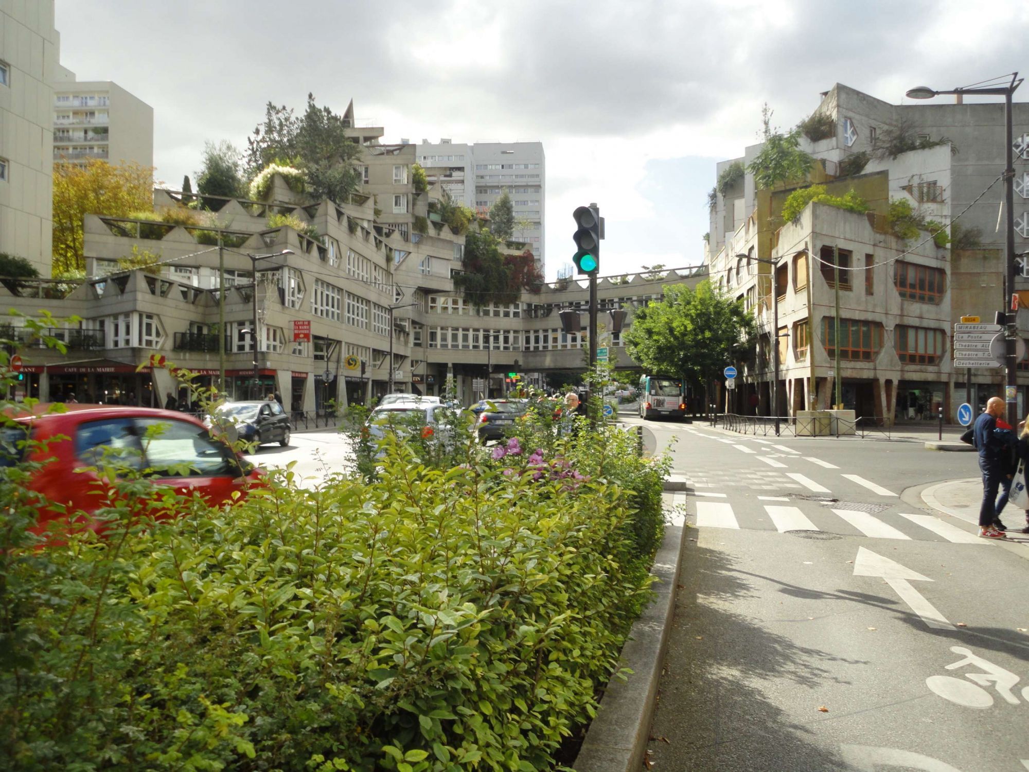 Au deuxième plan, le paysage a complètement changé. L’horizon est caché, de chaque côté de la rue, par des bâtiments en béton, de plusieurs étages, reliés entre eux par une passerelle couverte. Il s’agit d’un projet de rénovation très important du centre-ville initié par la municipalité d’Ivry. Les architectes, Jean Renaudie et Renée Gailhoustet, en ont conçu les plans dans les années 60-70. Ils devaient créer à la fois des logements, des commerces et permettre l’installation en plein centre-ville de services publics. Ils ont construit des logements avec des terrasses triangulaires très arborées et de grandes ouvertures vitrées. À l’intérieur du bloc gauche, une galerie commerciale, l’espace Jeanne Hachette, a été réalisée ainsi que des petits commerces, au pied des immeubles. La Médiathèque, l’espace Gérard Philipe, le Trésor Public s’y sont aussi installés. Il faut maintenant dépasser la passerelle qui relie les deux blocs d’habitations et de commerces pour voir l’église qui a très peu changé.