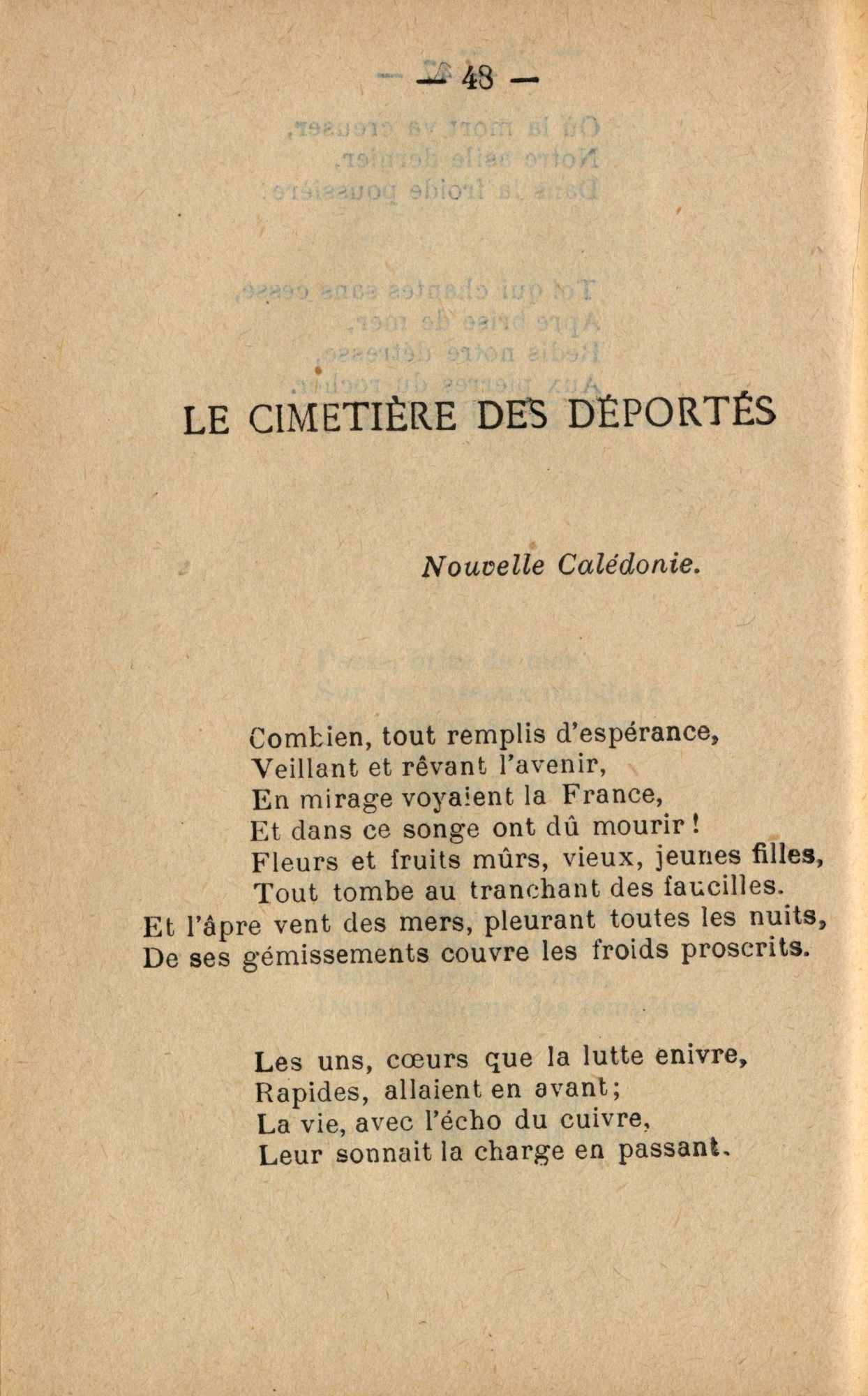 Le 24 août 1873, Louise Michel embarque à destination de la Nouvelle Calédonie. Une autre communarde, Nathalie Lemel*, est avec elle à bord du Virginie. Arrivée à Nouméa, elle est conduite dans l'enceinte fortifiée de la presqu'île Ducos puis transférée à la baie de l'Ouest. Elle s'intéresse aux Kanaks ainsi qu'à leur culture et dénonce le sort qui leur est réservé. Sa peine est commuée en déportation simple. Elle vient alors vivre à Nouméa où elle enseigne aux enfants de déportés puis dans une école communale de filles kanakes. Elle souhaite que celles-ci reçoivent la même éducation que les garçons.