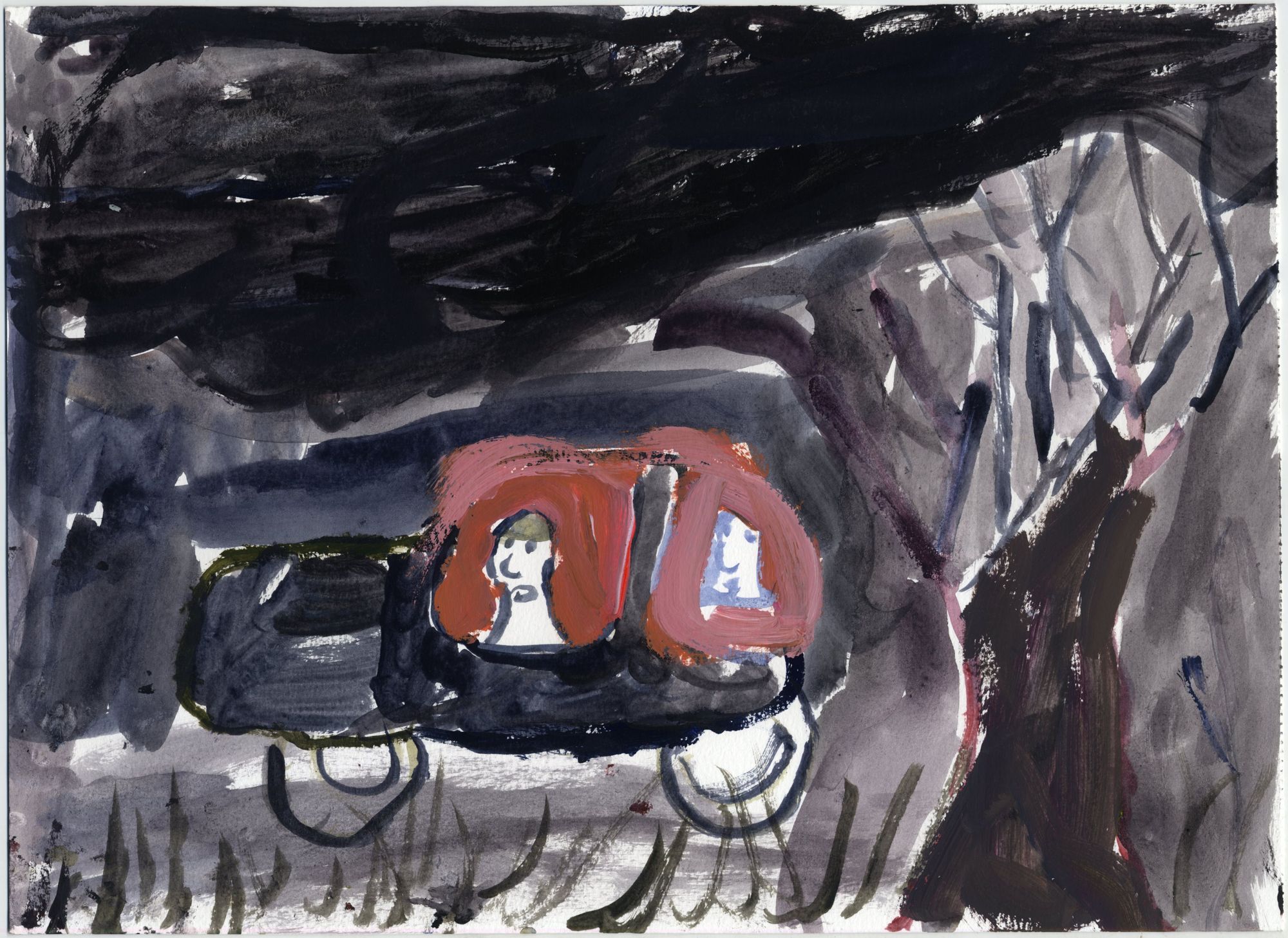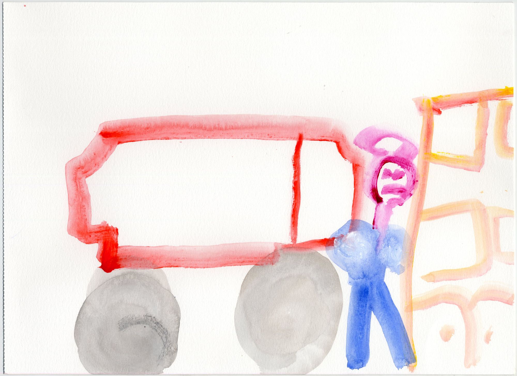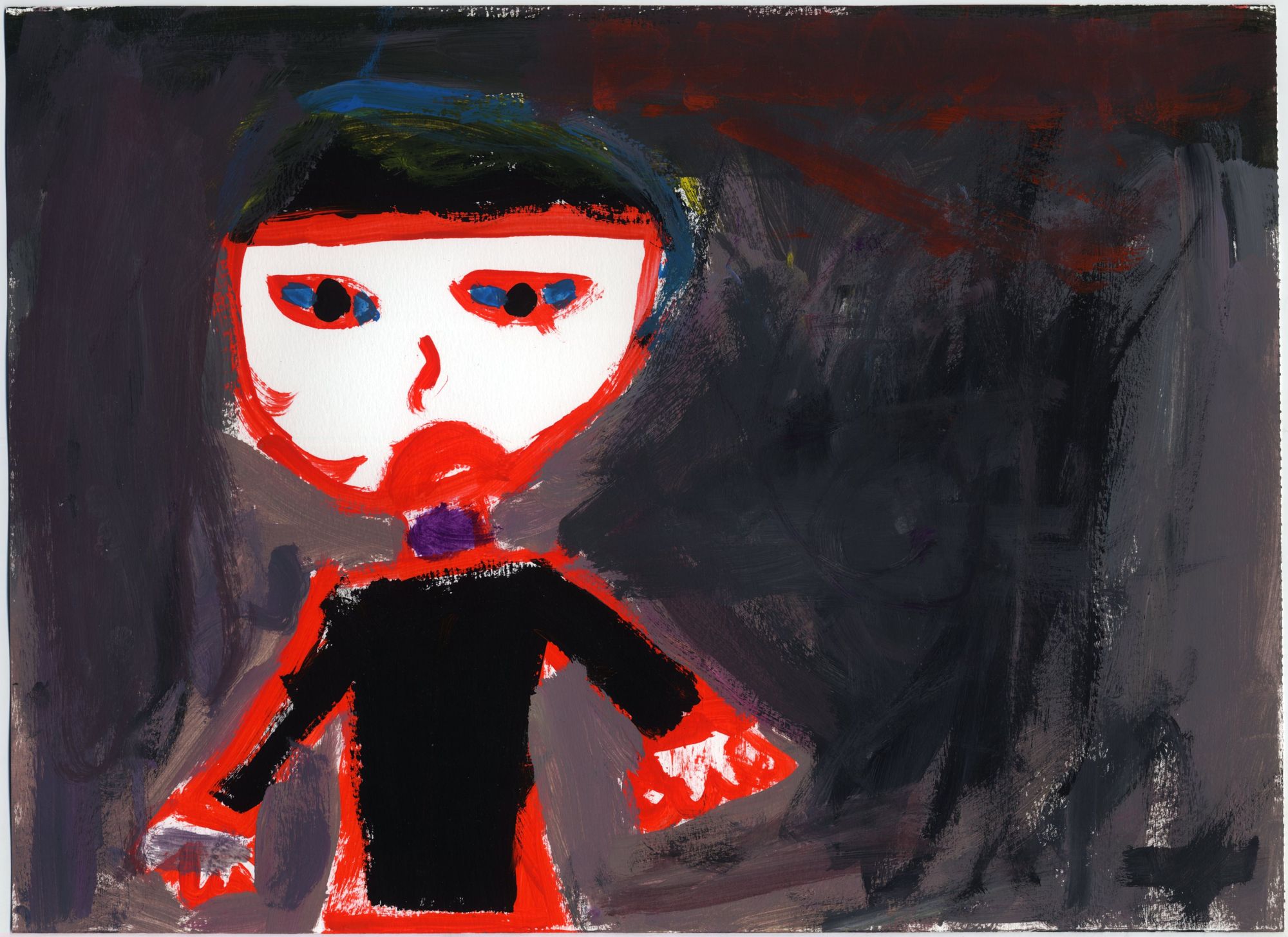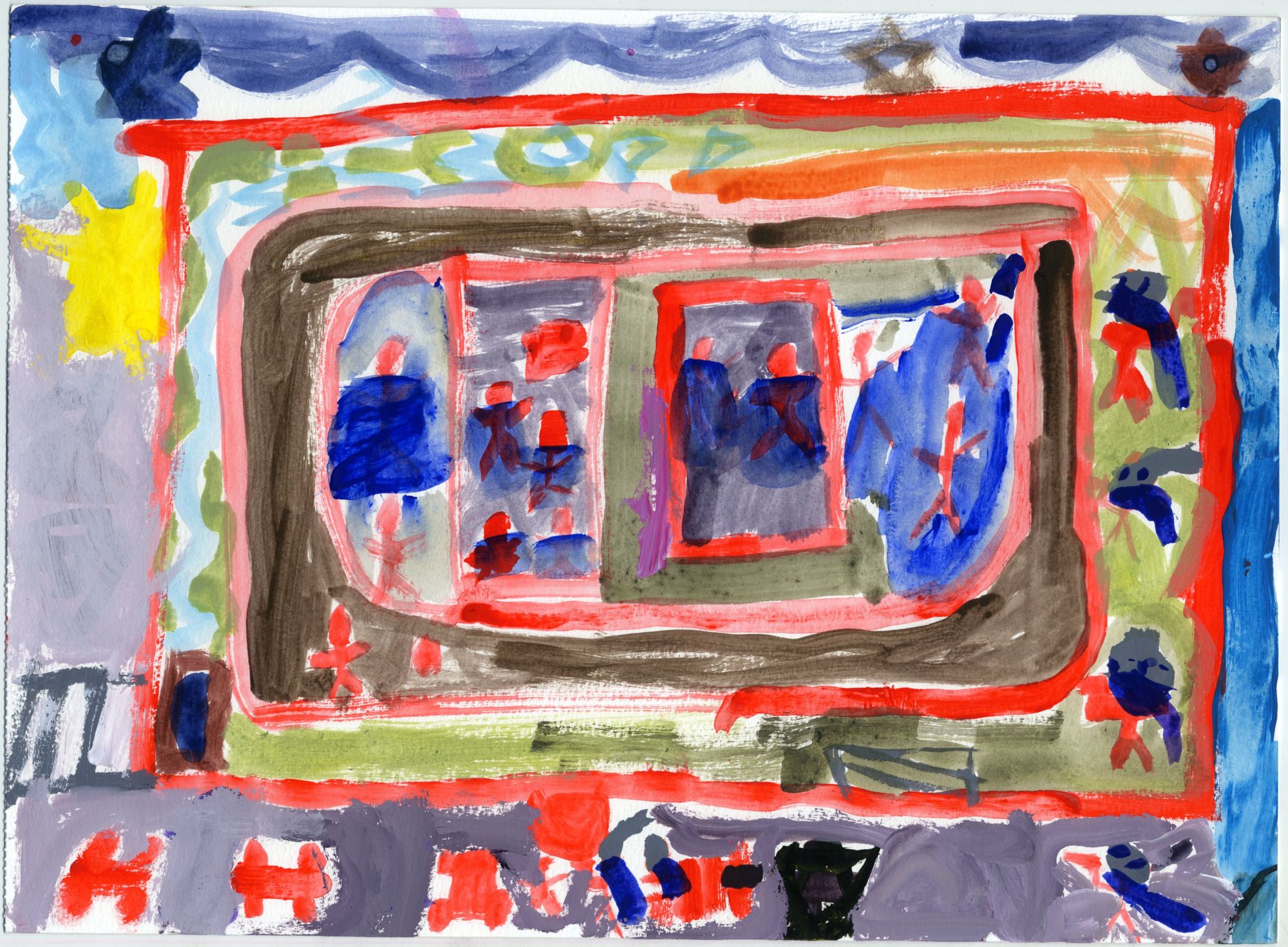 Séance 2 : Nous avons commencé par dessiner avec de la peinture rouge vermillon (pour l’aspect lumineux et expressif de la couleur), puis peint les surfaces en ajoutant du jaune et du bleu dans la palette. Nous avons vu comment diluer la peinture pour obtenir des transparences ou gratter dans la matière avec le manche du pinceau pour redessiner dans la couleur ou créer des textures.