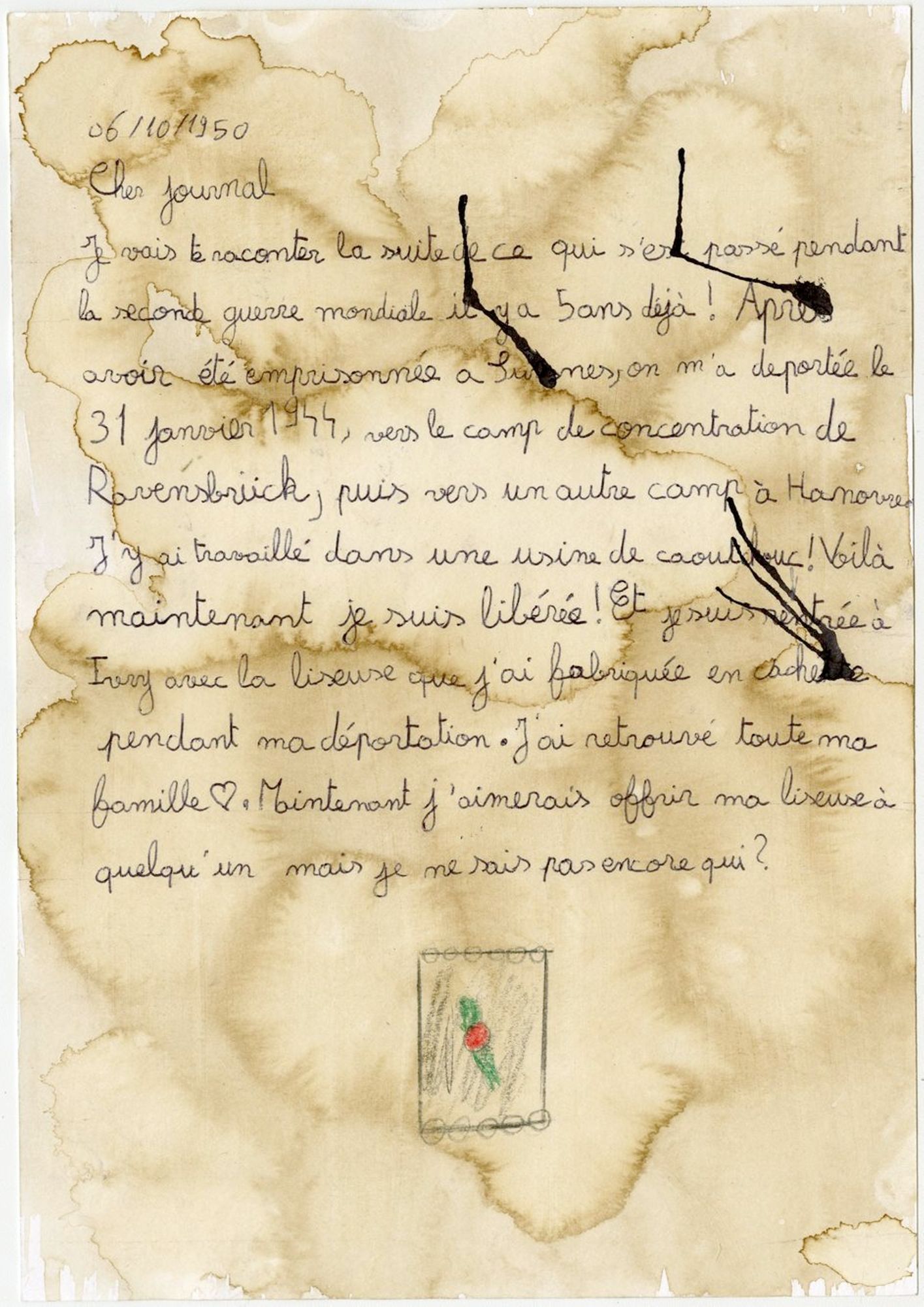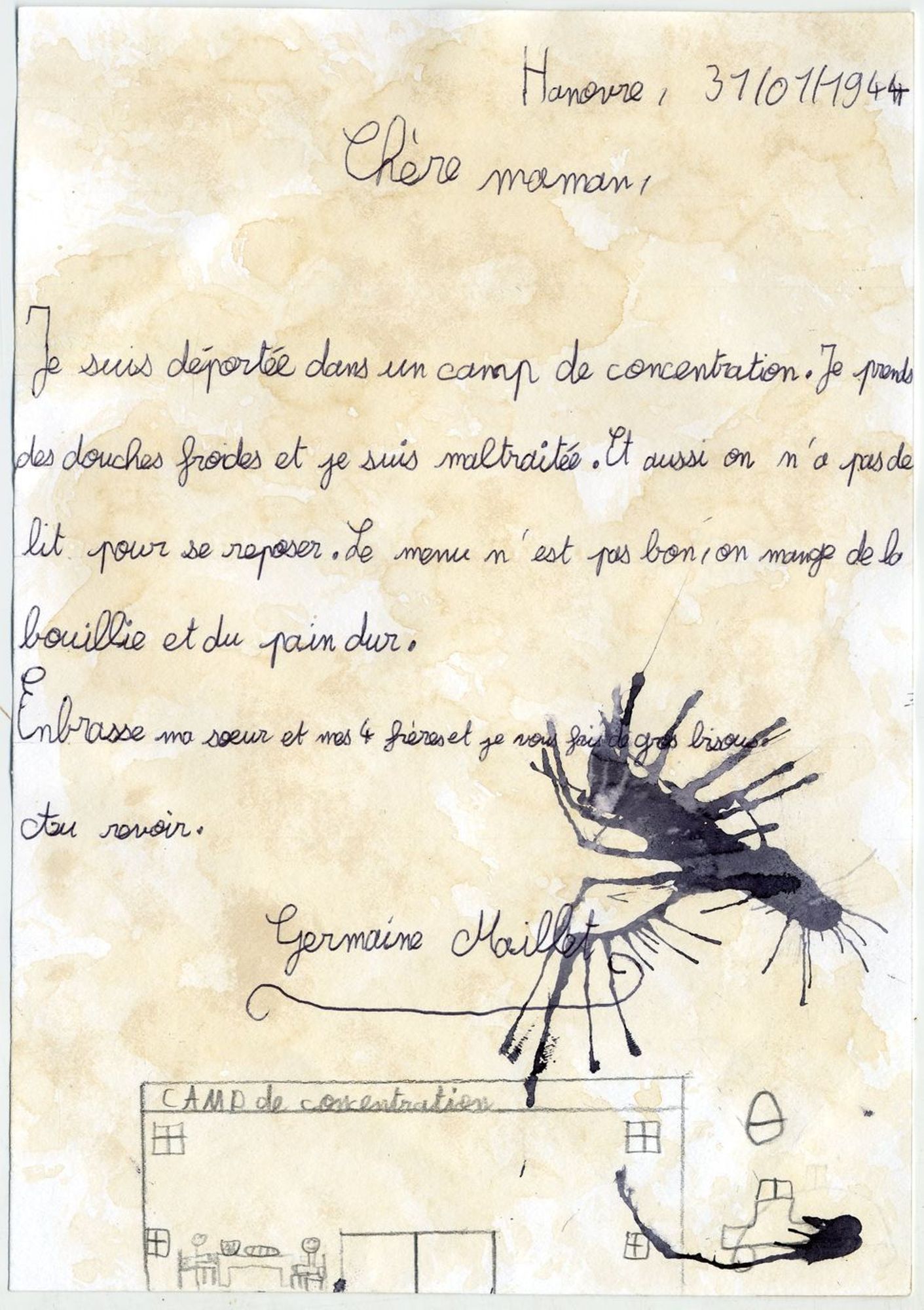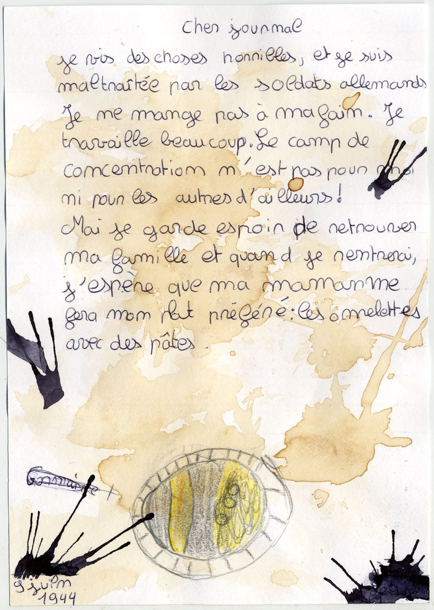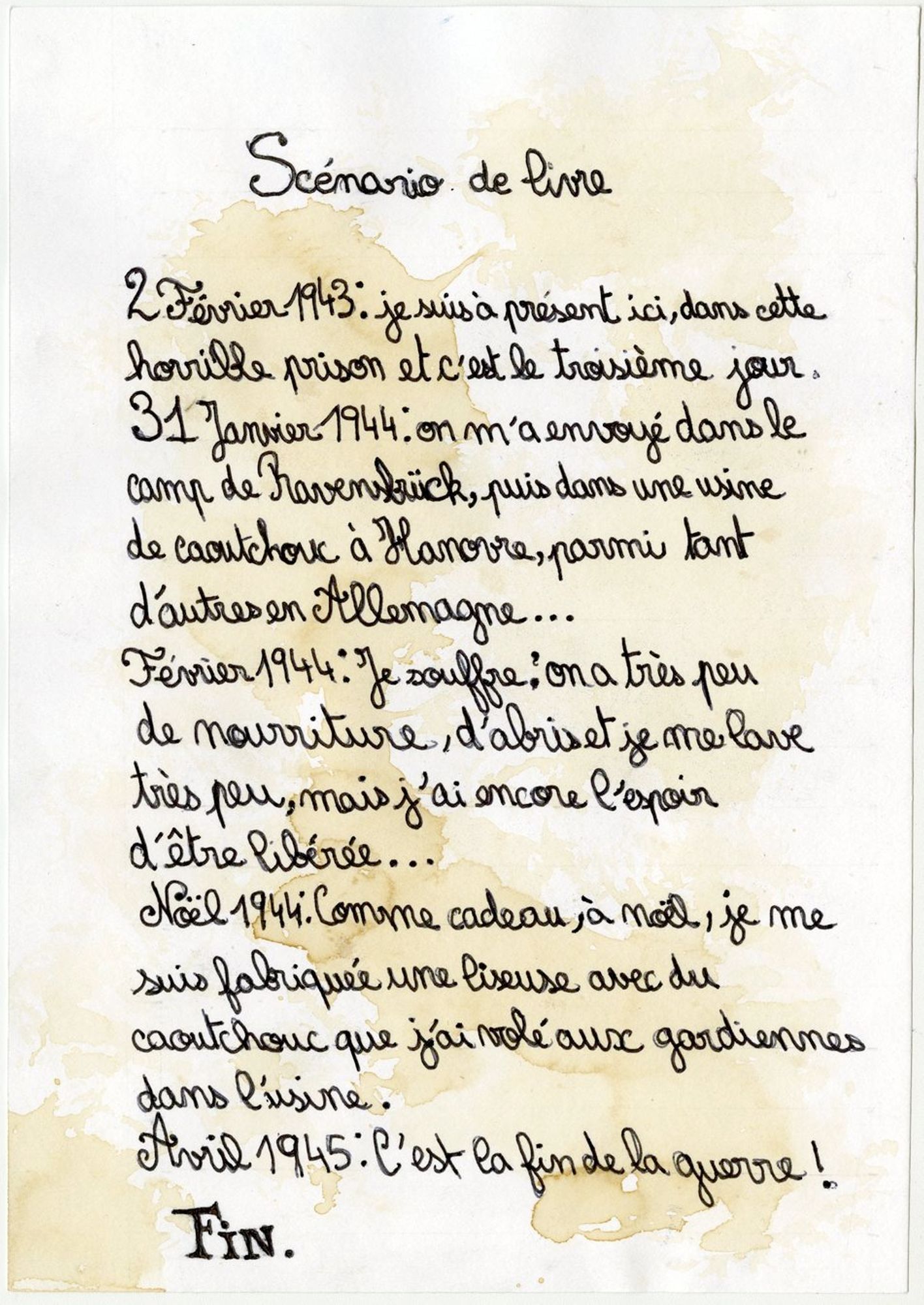 En trois séances de travail en classe, les élèves ont conçu un recueil de textes qu’ils ont imaginé comme celui que Germaine Maillet aurait pu conserver dans sa liseuse pendant sa déportation et après sa libération. Par souci de réalisme, ils ont mobilisé tout ce qu’ils ont appris de sa vie et se sont inspirés des réalisations clandestines des déportés dans les camps de concentration nazis. Ils ont produit des lettres, des poèmes, des récits documentaires, des recettes de cuisine… Àtravers la sensibilité et l’imagination des élèves, ces textes interprètent et incarnent des étapes du parcours de Germaine Maillet durant la Seconde Guerre mondiale.