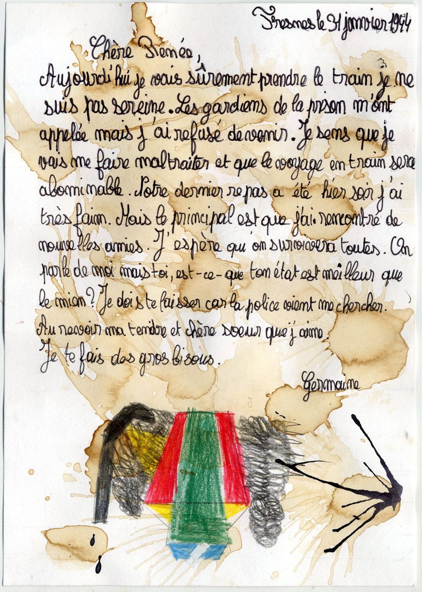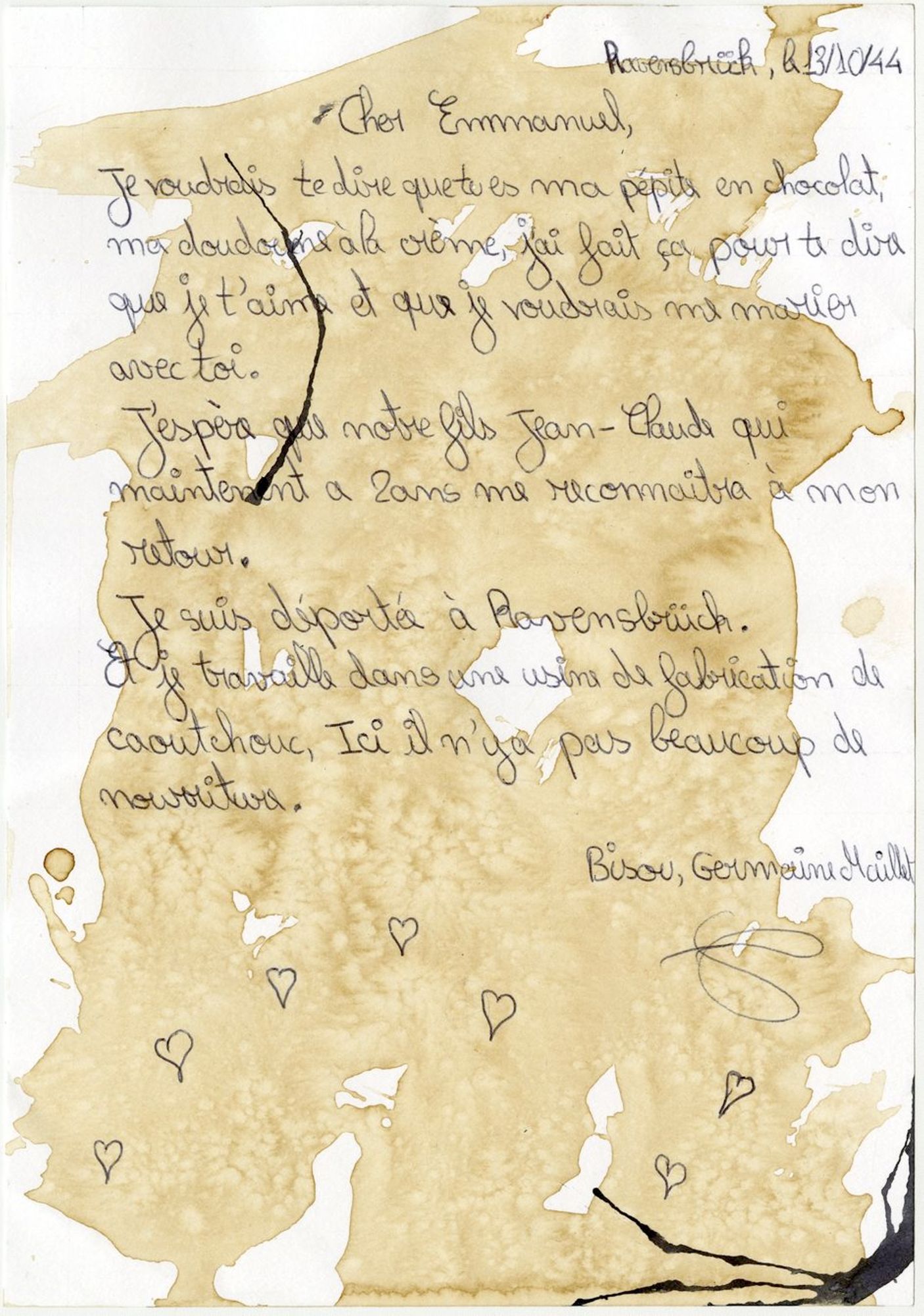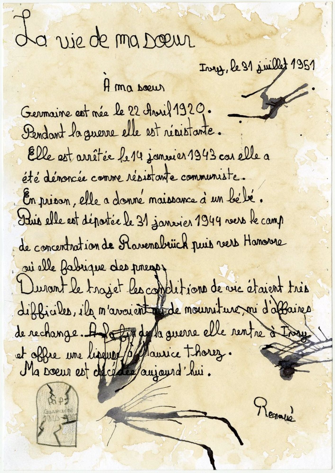 Le 15 mai 1942, sa sœur est arrêtée par la police française puis emprisonnée pour action de propagande au sein de la résistance communiste. Suite à une dénonciation, Germaine Maillet est arrêtée le 14 janvier 1943 pour le même motif que Renée. En juin 1943, elle donne naissance à un garçon prénommé Jean-Claude qu’elle ne peut garder auprès d’elle en détention. Elle est déportée par les autorités allemandes vers le camp de concentration de Ravensbrück le 31 janvier 1944, puis transférée dans un camp de travail à Hanovre où elle fabrique des pneus pour l’armée allemande. Clandestinement, elle réussit à voler des chutes de caoutchouc avec lesquelles elle se confectionne une liseuse en guise de cadeau de Noël.