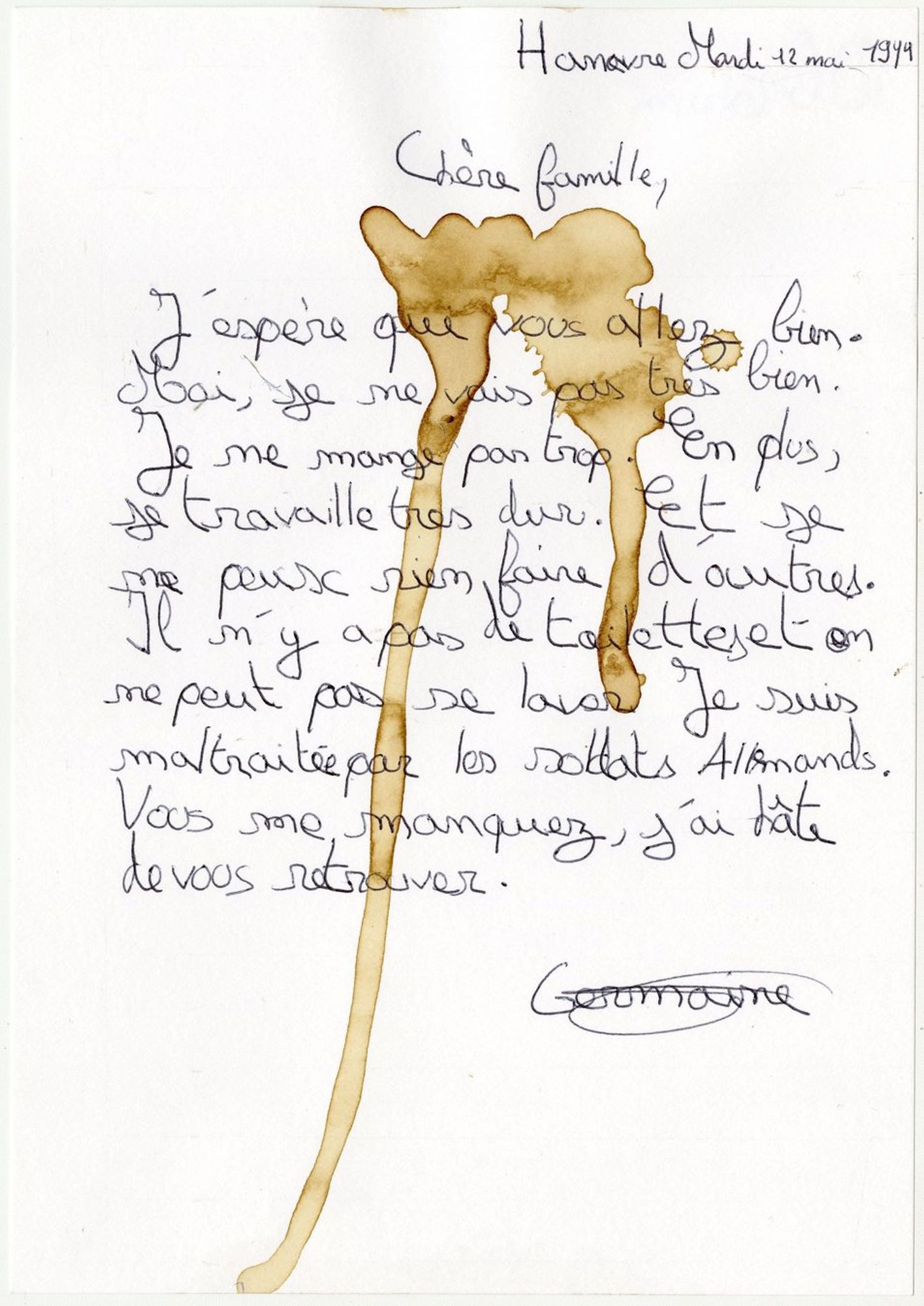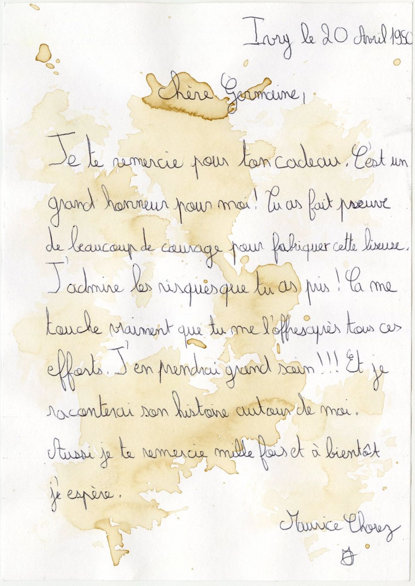 En avril 1945, Germaine Maillet est libérée grâce à l’avancée des troupes alliées. De retour à Ivry, elle retrouve son fils et sa famille. En 1950, elle offre sa liseuse à Maurice Thorez, secrétaire général du Parti Communiste français et député d’Ivry, à l’occasion de son 50ème anniversaire. Mariée à Emmanuel Chagnas le 19 novembre 1945, elle décède le 31 juillet 1951.