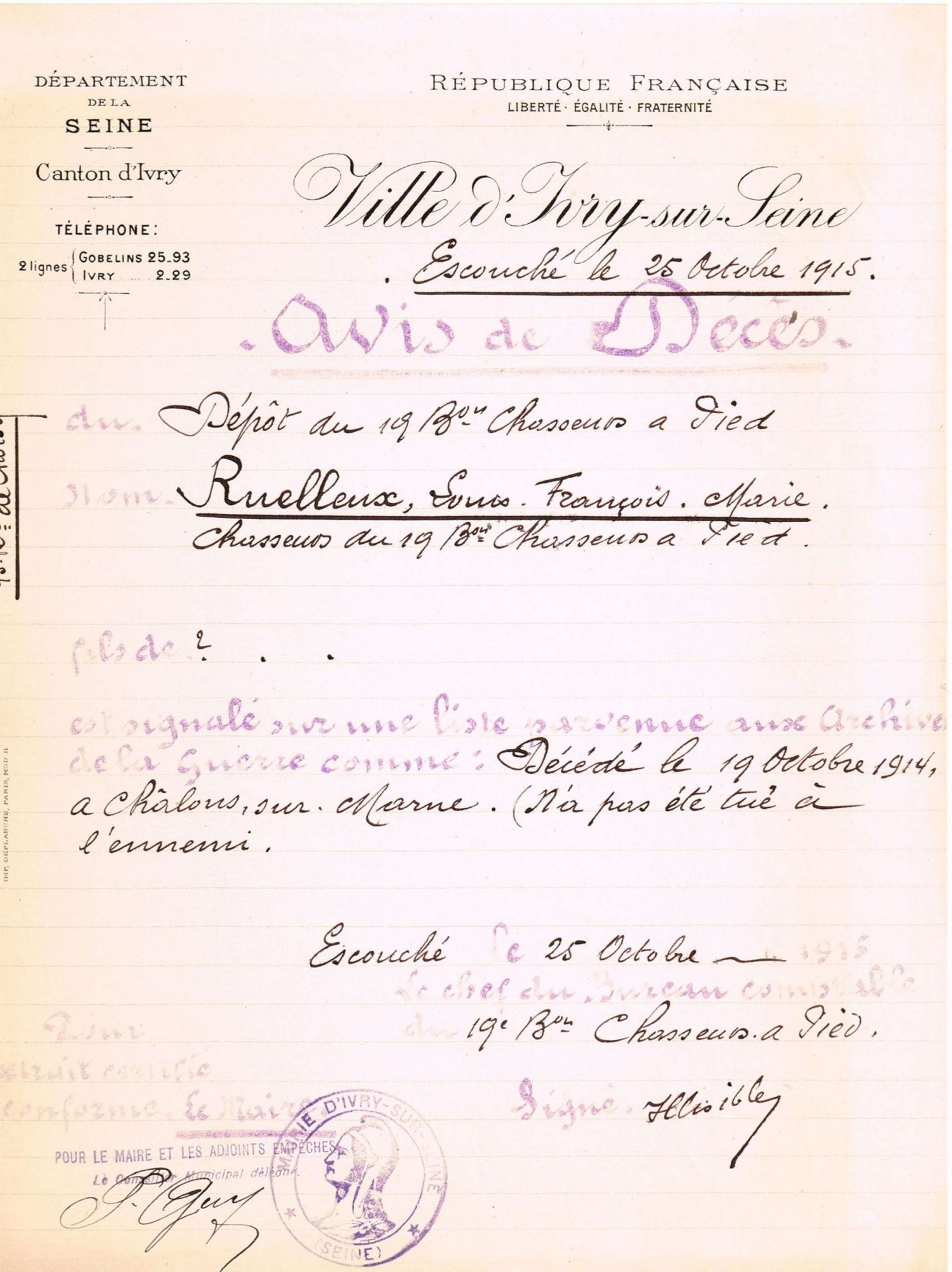 Les parents de Louis Ruelleux habitaient 45 route de Choisy (actuelle avenue de Verdun). Sur la liste des orphelins de guerre, on relève le nom de Madeleine Ruelleux, fille d'Amélie Augustine Ruelleux soeur de Louis Ruelleux, mort à Ivry-sur-Seine le 16 juillet 1915, probablement des suites d'une maladie pulmonaire contractée pendant son engagement.