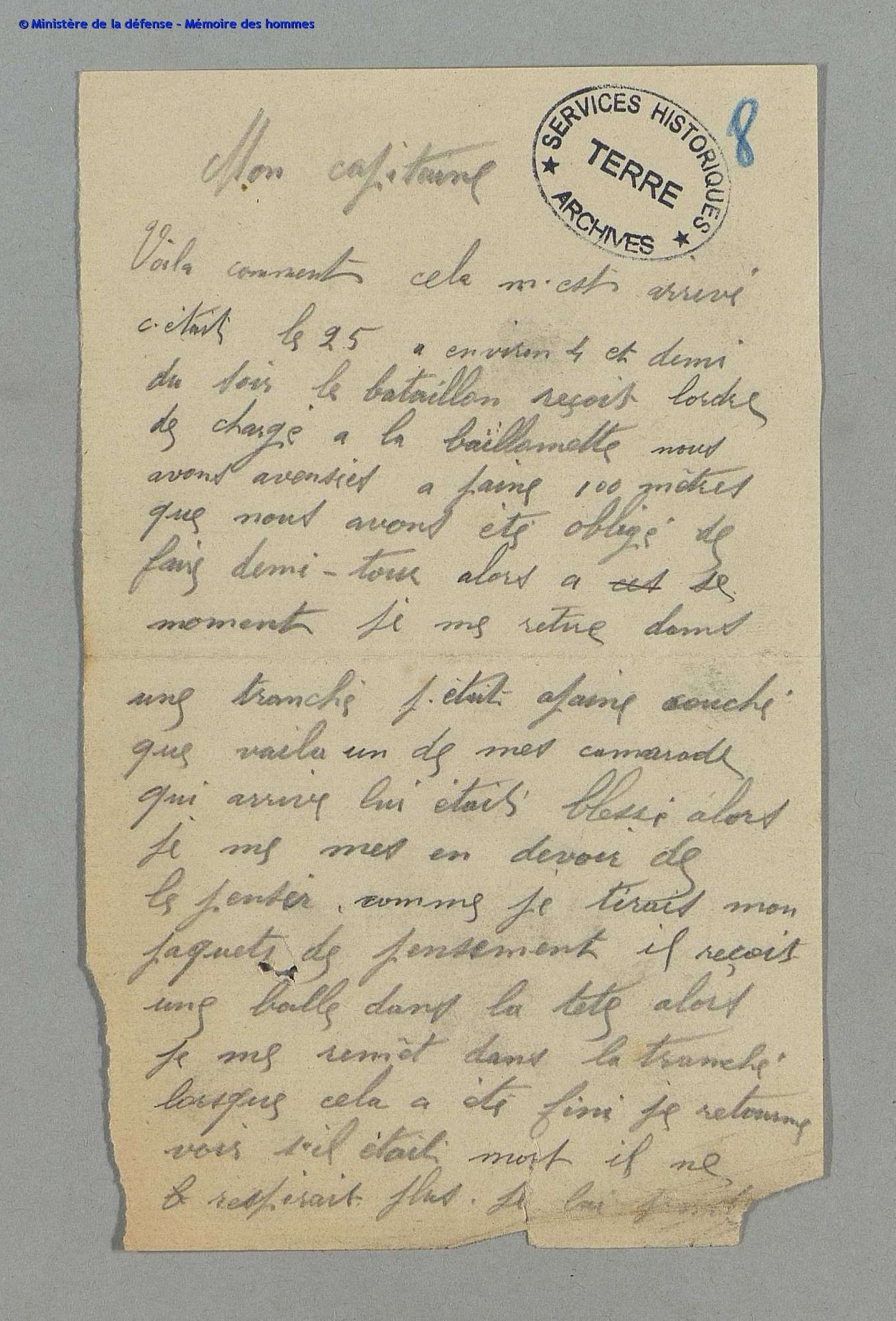 « C’était le 25 [septembre 1914] explique-t-il, à environ 4 heures et demi du soir. Le bataillon reçoit l’ordre de changer de baïonnette. Nous avons avancé à peine cent mètres que nous avons été obligés de faire demi-tour. Alors, à ce moment, je me situe dans une tranchée. J’étais à peine couché que voilà un de mes camarades qui arrive, lui était blessé. Alors je me mets en devoir de le panser. Comme je tirais mon paquet de pansements, il reçoit une balle dans la tête. Alors je me remets dans la tranchée. Lorsque cela a été fini, je retournais voir s’il était mort. Il ne respirait plus. Je lui [pris] une partie de ses cartouches et son fusil. Comme le mien avait une vis de partie, je le prends par le bout du canon sans savoir qu’il était chargé. Je le traîne. Je ne sais si sa gâchette se prend dans un bout de bois : le coup me part dans la main. Mais ne croyez pas que je l’ai fait exprès, je ne suis pas un lâche, je suis un Français qui ne demande qu’à retourner au feu ».