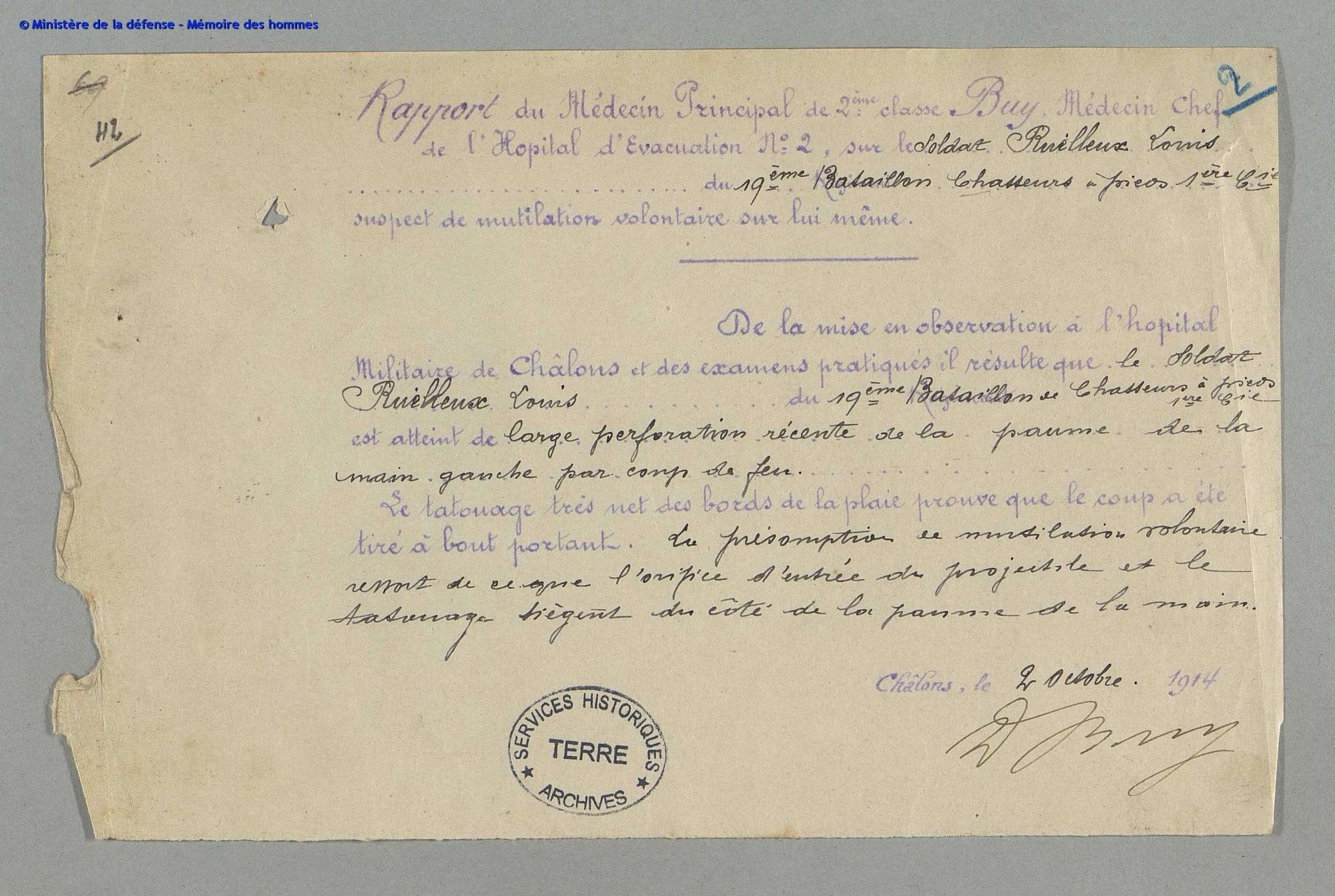 Le 25 septembre 1914, durant une phase de combat devant le fort de La Pompelle (Marne), Louis Ruelleux se tire involontairement une balle dans la paume de la main gauche. Examiné par le médecin-chef Buy, ce dernier suspecte un cas de mutilation volontaire.