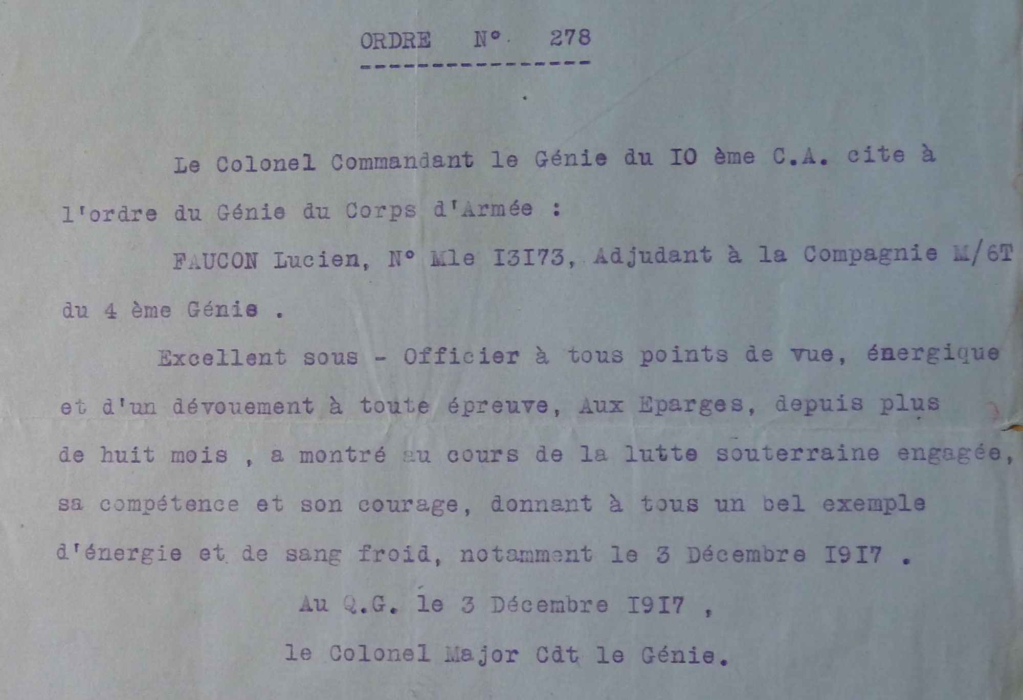 Au mois de mars 1917, la compagnie est mise à la disposition du directeur des travaux des mines dans le secteur des Eparges (Meuse). Elle travaille au boisage des galeries et à la construction d'abris intérieurs de la mine. Dans son journal, Lucien Faucon évoque la violence des combats. Une citation à l'ordre des Armées lui est attribuée en décembre 1917 : "Aux Eparges depuis plus de 8 mois, a montré au cours de la lutte souterraine engagée, sa compétence et son courage [...]". En mai 1918, la compagnie quitte les travaux des mines aux Eparges (Meuse). Lucien Faucon note dans son journal :