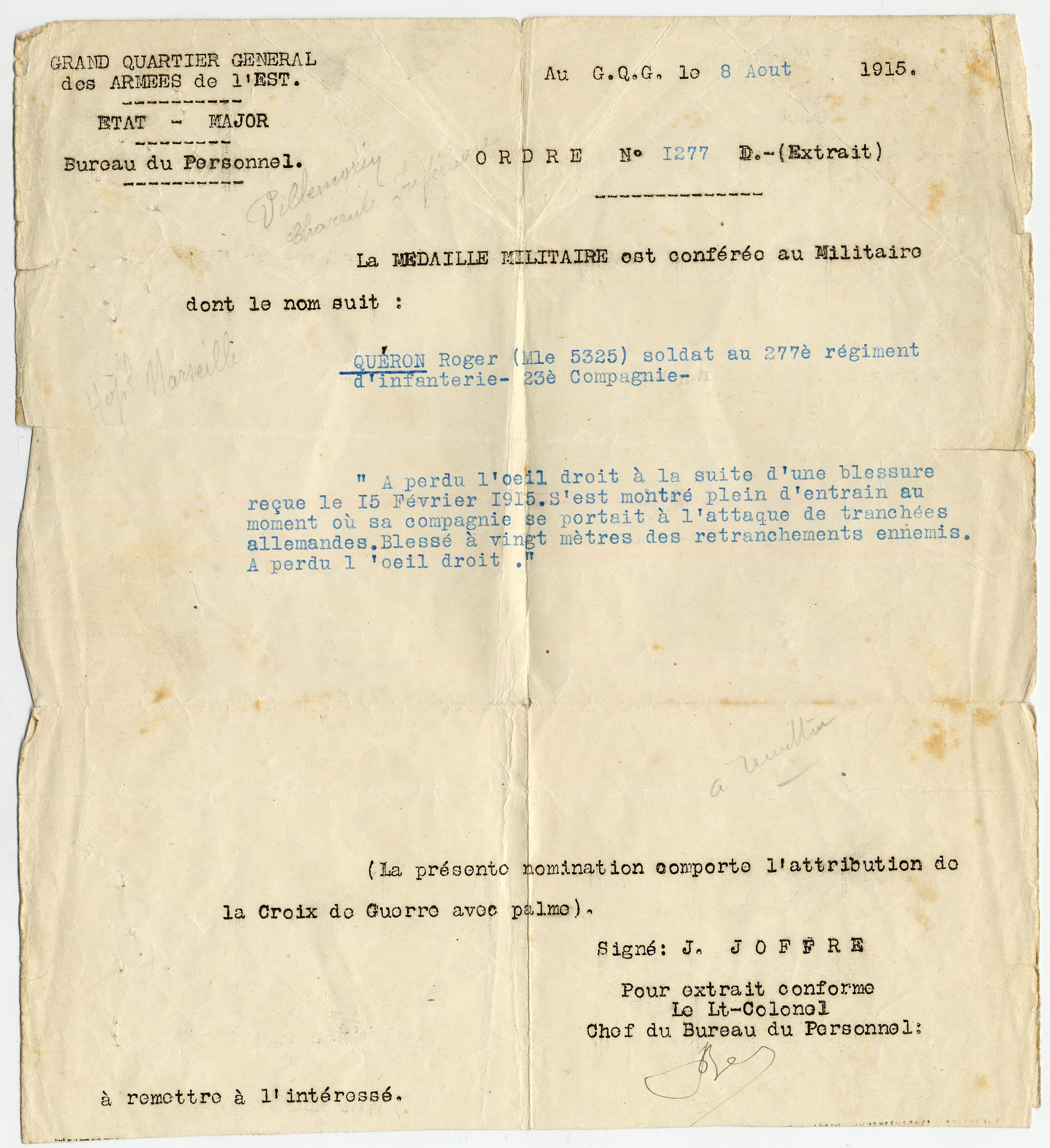 La Croix de guerre lui est attribuée le 8 août 1915. La citation qui l'accompagne précise : "A perdu l'œil droit à la suite d'une blessure reçue les 15 février 1915. S'est montré plein d'entrain au moment où sa compagnie se portait à l'attaque des tranchées allemandes. Blessé à vingt mètres des retranchements ennemis".