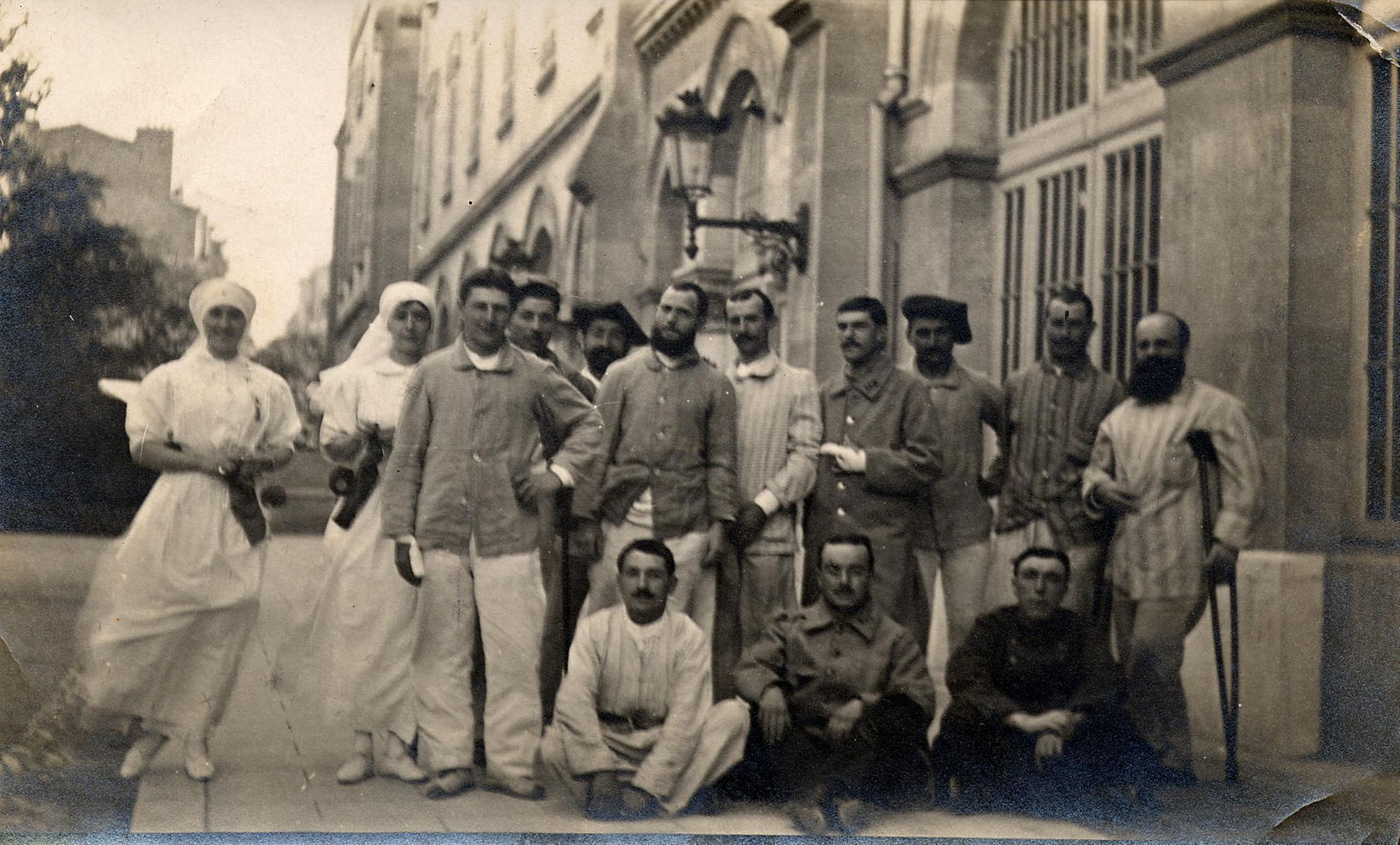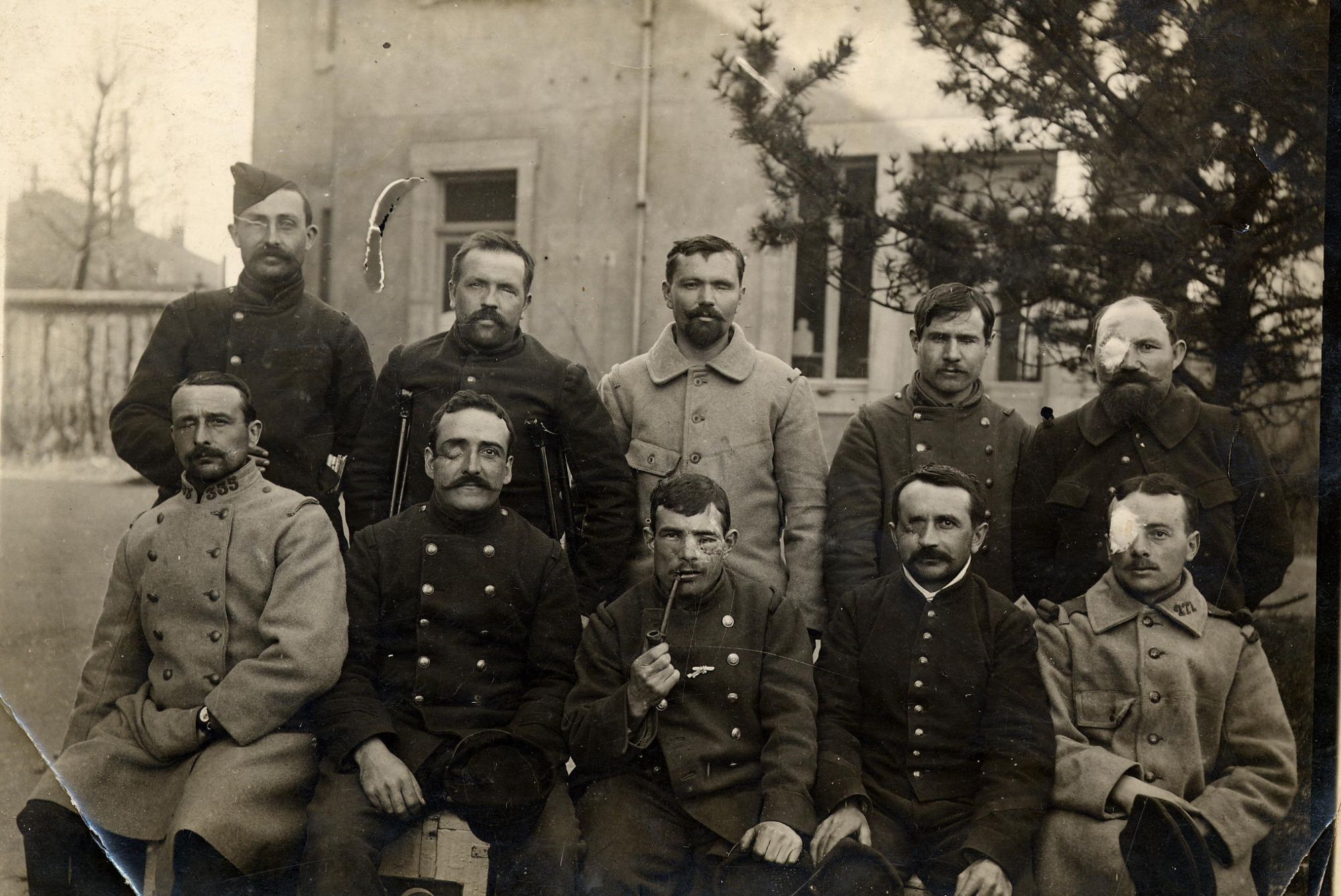 Cher Papa…Je t’envoie aujourd’hui une vue assez convenable, car notre médecin a voulu nous prendre en photo tous les plus blessés. Ainsi je profite de l’occasion pour vous envoyer toutes ses belles têtes, car dans le pavillon c’est rien que des blessés comme ça. Tu vois on est tous beau garçons. Celui-là qui a les bequilles il a une jambe coupé et un œil arraché, il en a sa part lui aussi. Moi c’est un tampon de coton sur l’œil droit. Cela m’est changer tous les jours. Le Marsouin qui a la pipe ils lui ont opéré trois fois la joue, il lui prenait de la peau ailleurs pour lui mettre sur la joue. Il est du 7e Colonial de Bordeaux il y en a de partout un peu, mais on a pas l’air trop malheureux quand même. Je vais te recommander de me la conserver cette photo car j’ai que celle là, je veux la retrouver quand j’irais chez nous fais la voir aux voisin et amis et place la qu’elle ne s’ecrase pas. Je suis toujours en bonne santé, je t’en desire une pareille.Ton Fils qui t’embrasse.